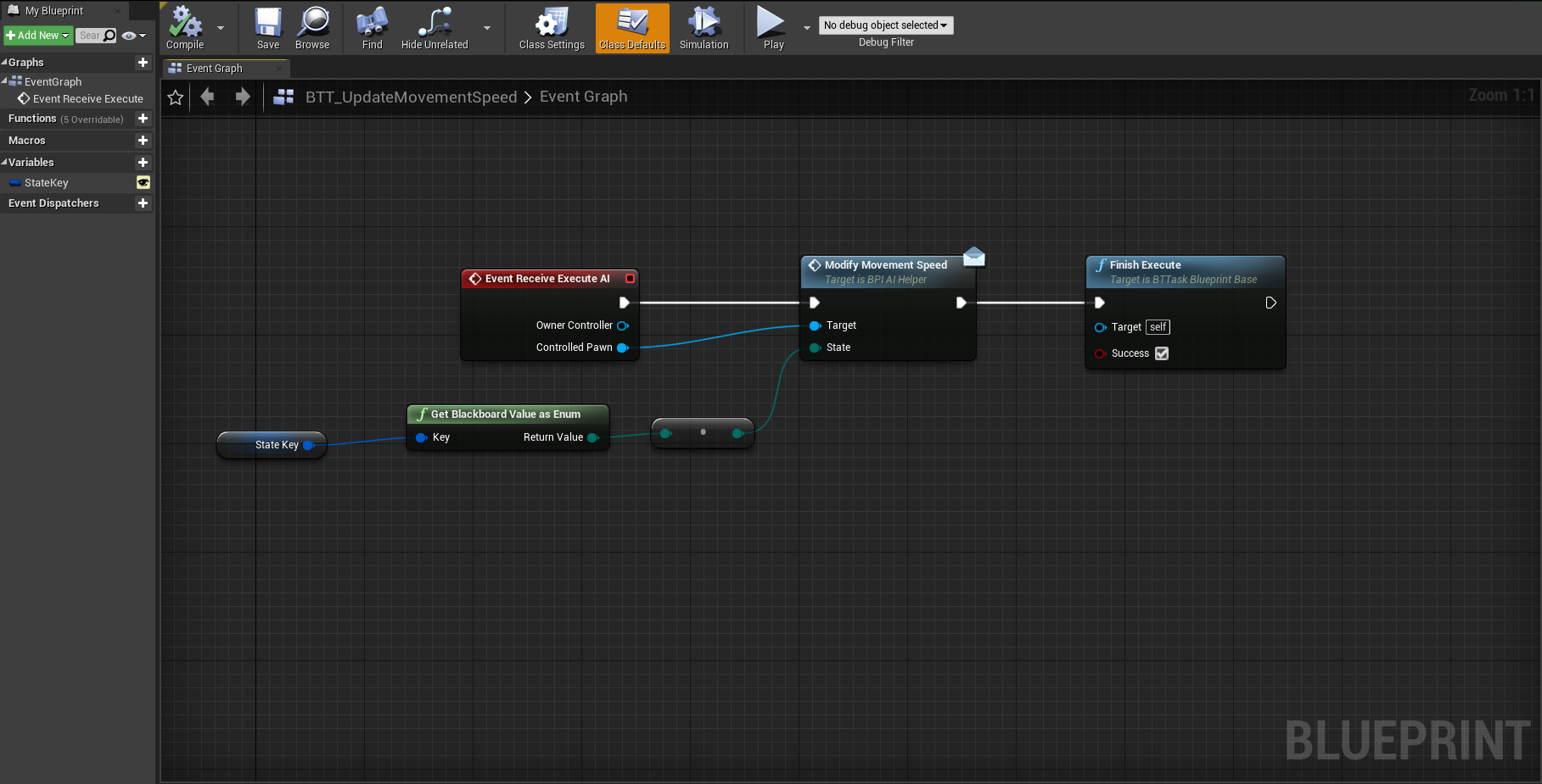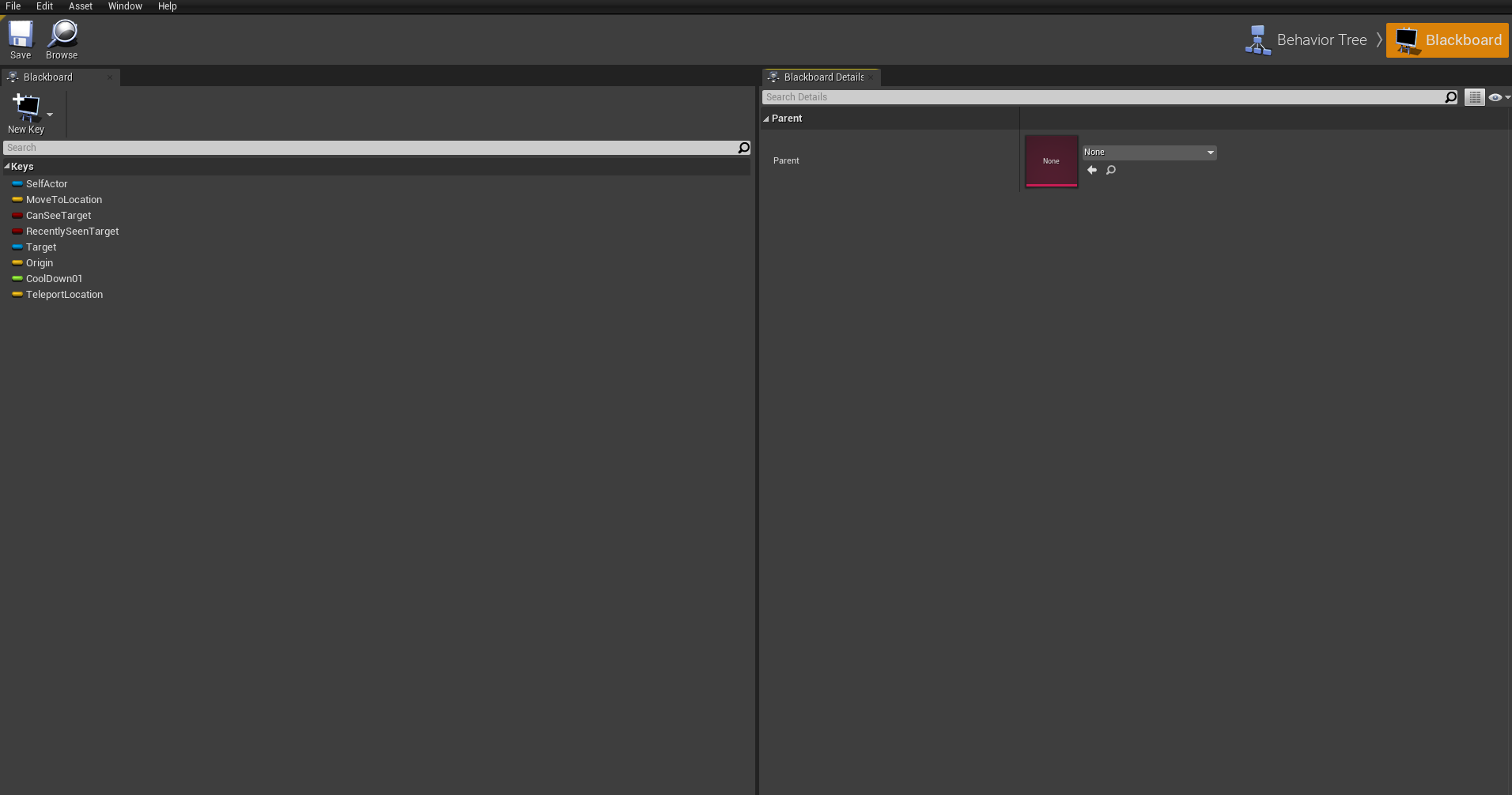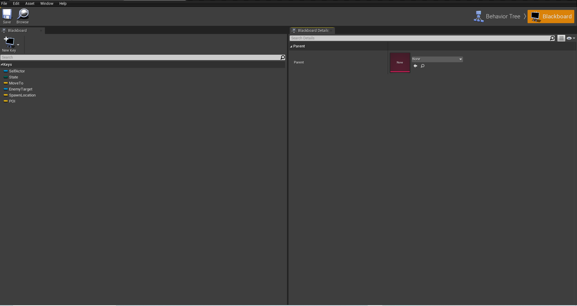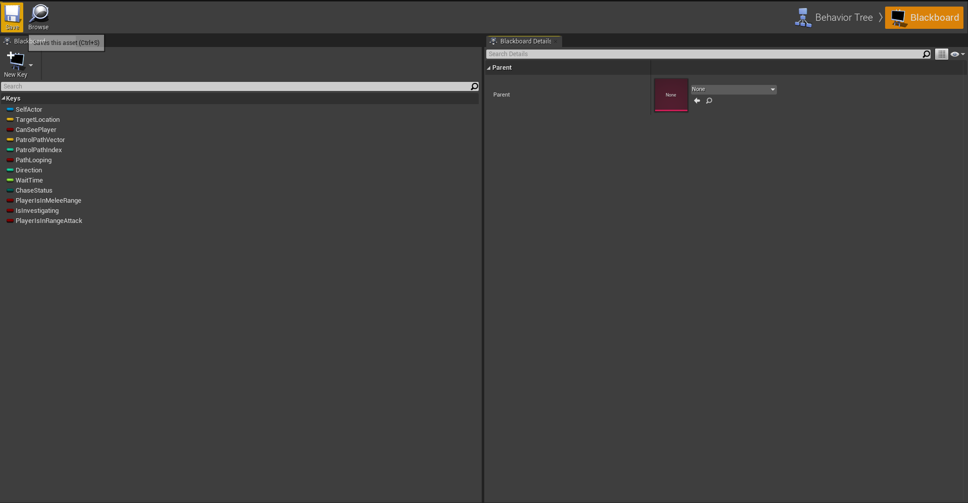 The Enemy Behavior Blackboard holds all of the variables that are needed for the Behavior Tree to function. The Blackboard has been described as the “brain” that allows the Behavior Tree to function.