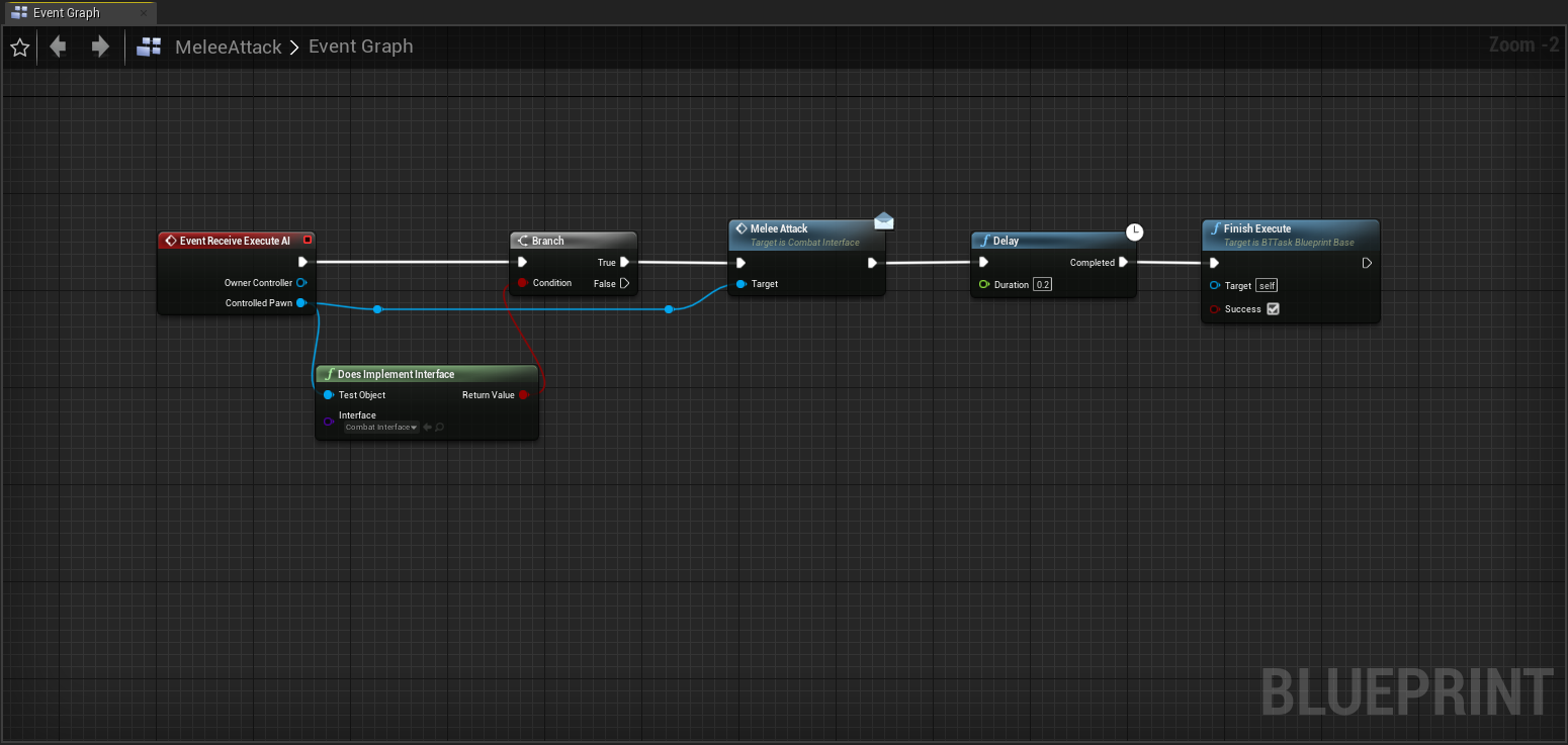 The Skeleton Archer is the first ranged attack enemy that the player confronts within the Beholder’s lair. It was a challenge to create and develop the behavior tree of the Skeleton Archer as there are not many resources on developing Enemy AI that use bows and arrows in game. In particular, there was an issue with the transitioning between patrolling, searching, aiming, and shooting for the Skeleton Archer. To overcome the issue, I had to develop a new Blendspace blueprint that would allow the Skeleton Archer to transition from each state in the behavior tree.