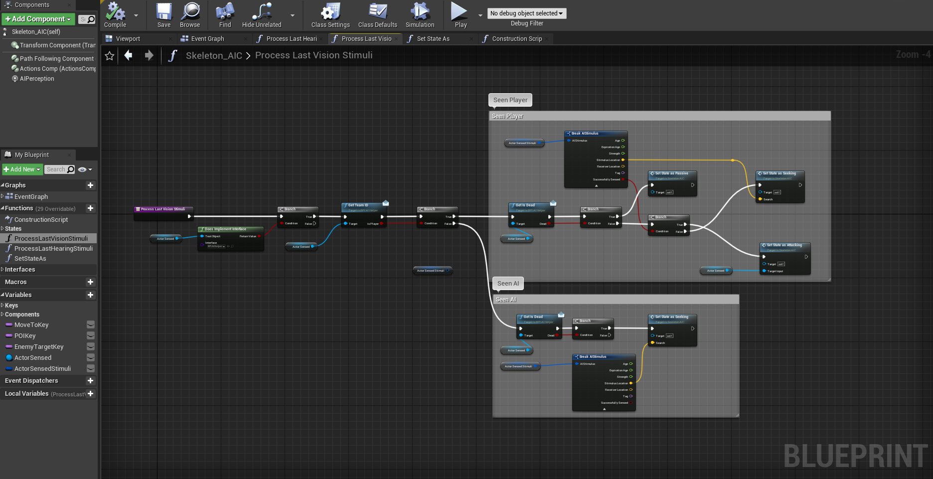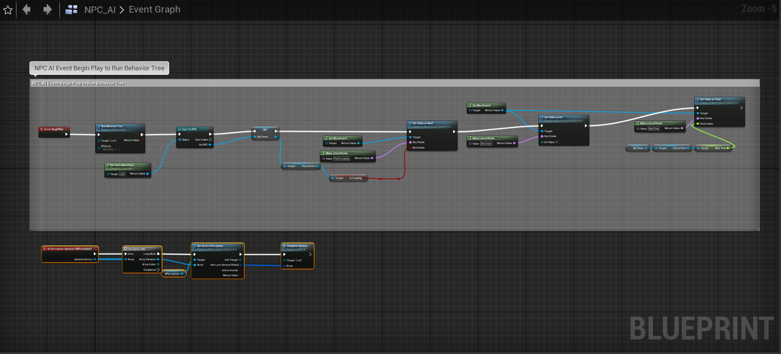 The Enemy AI Controller is main component that allows the Enemy Behavior Tree to run. Also, it provides the AI Perception component that allows the Enemy AI to perceive from the environment, pass the variables to the Black Board, and allow the Enemy AI Behavior Tree to run through its branches depending on the variables received from the Blackboard.