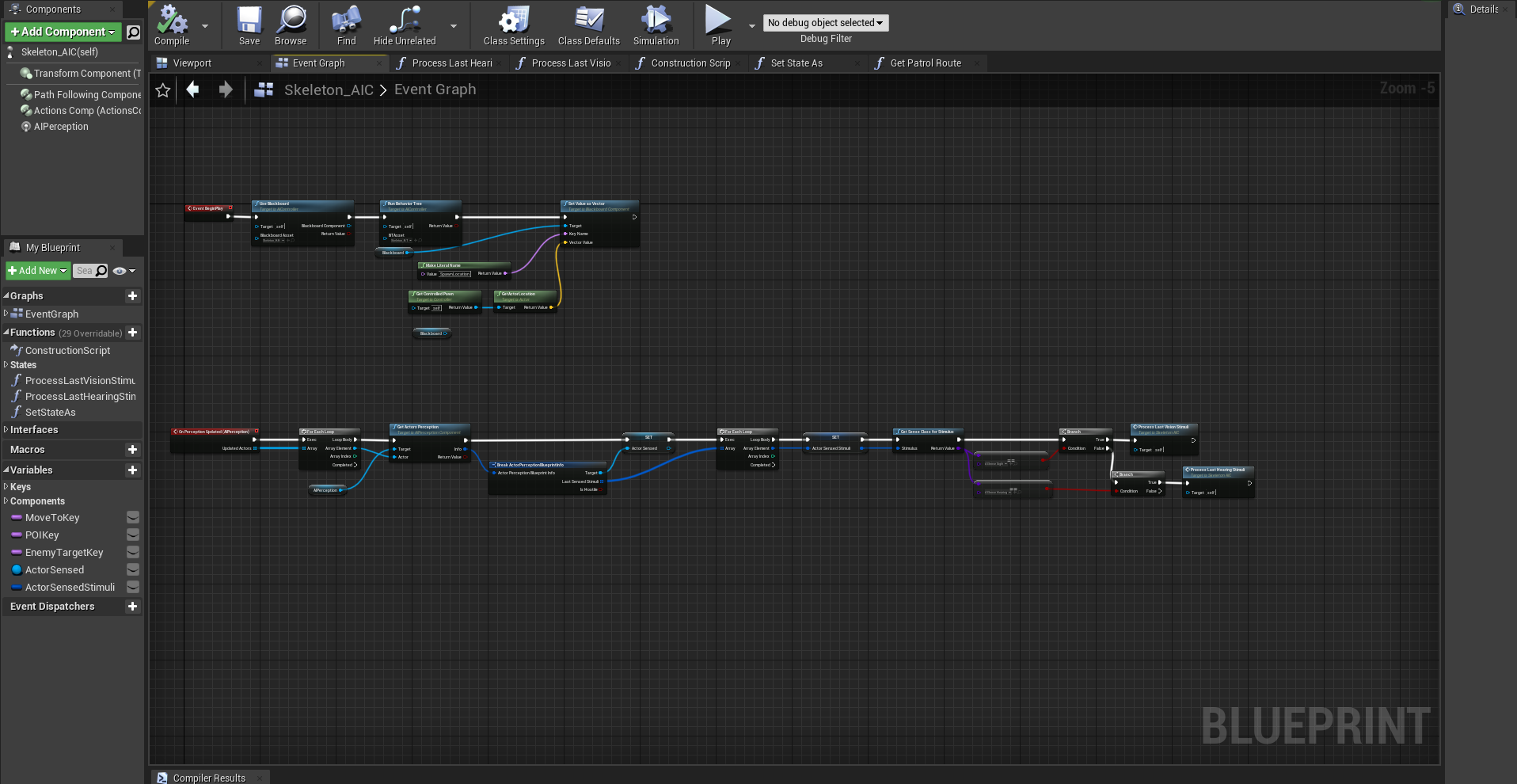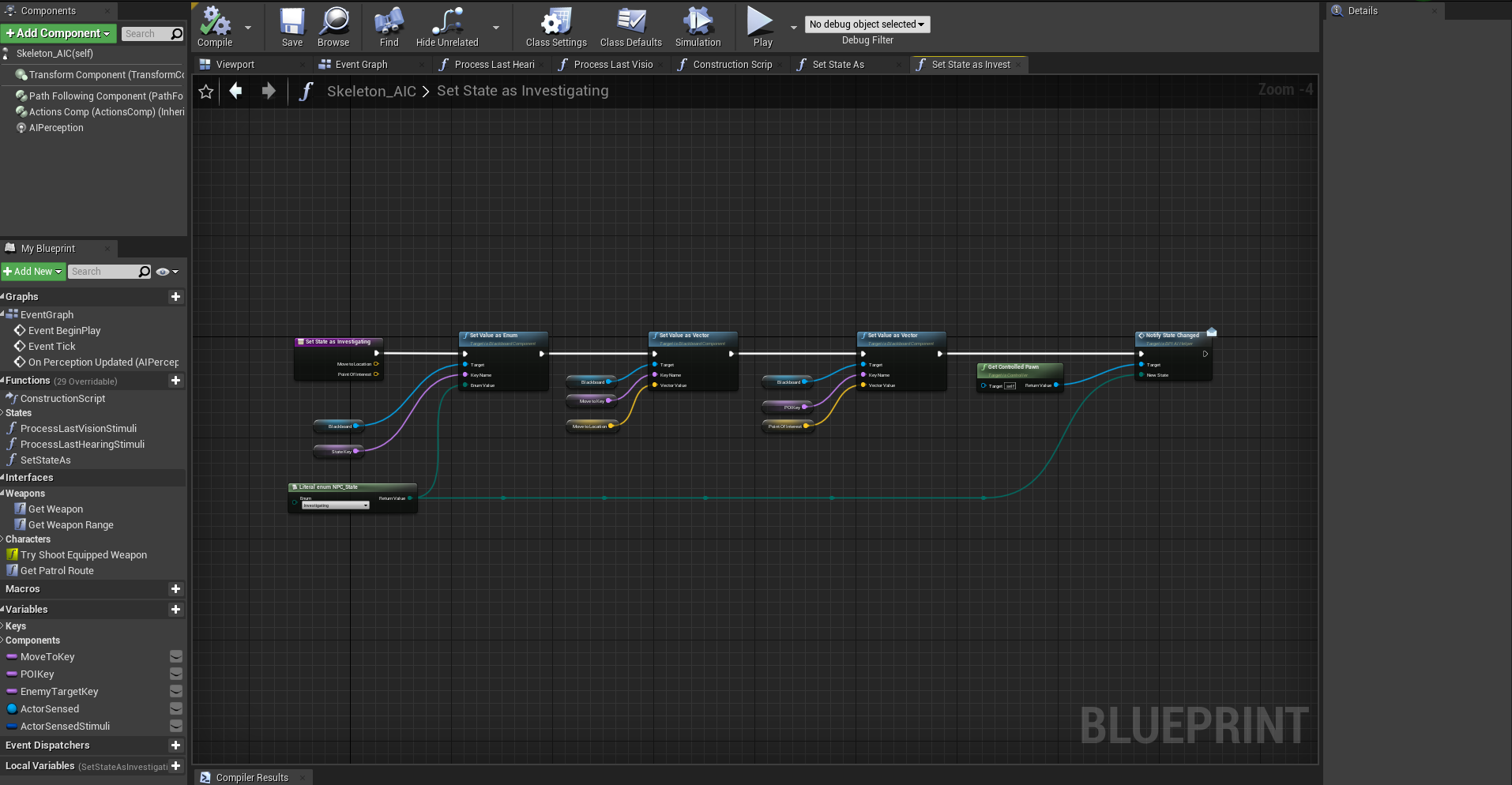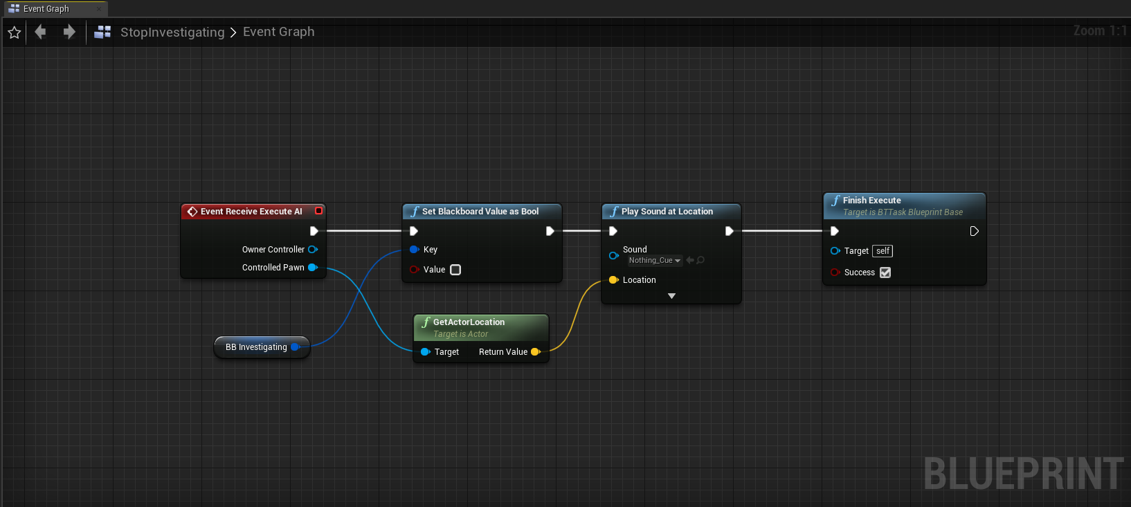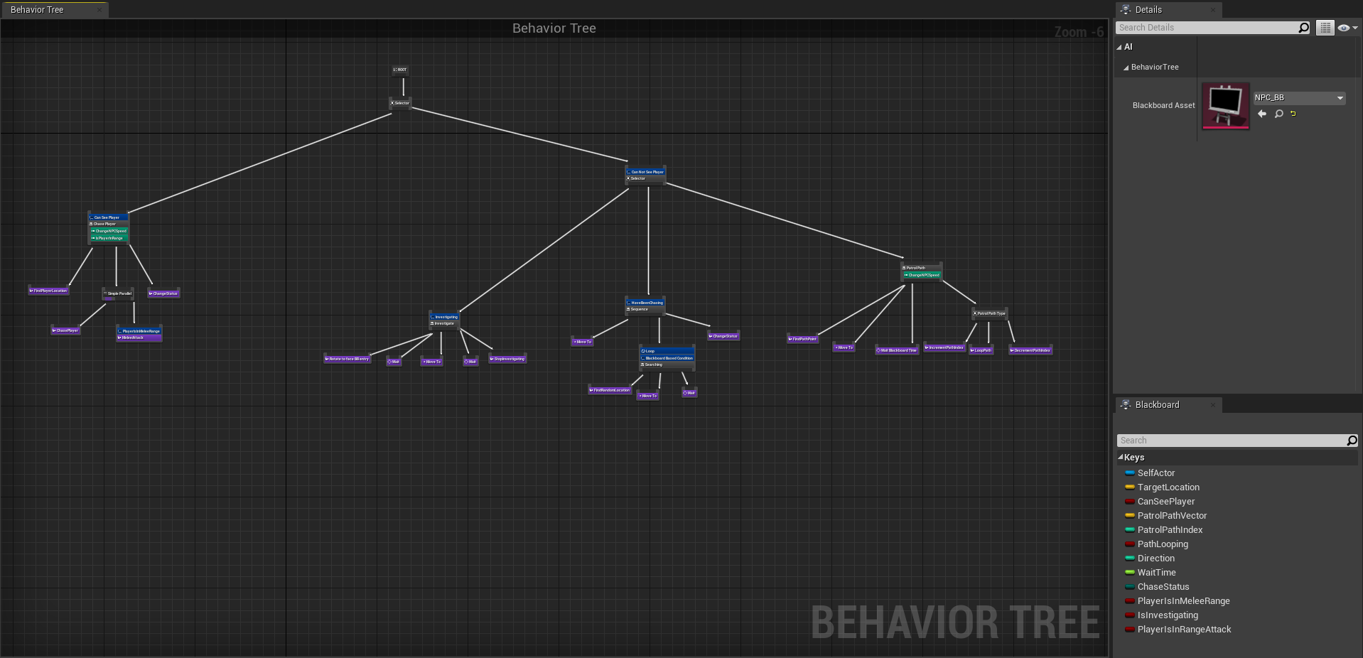 The first two enemies in the prototype of Beholder’s Treasure is the Undead Knight and the Skeleton Warrior. These two enemies have a series of behaviors that they perform in the prototype. From patrolling to investigating, to chasing, and attacking the player, their behavior tree allows them to provide an interactive experience for the player.