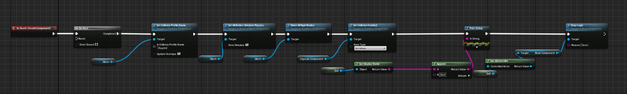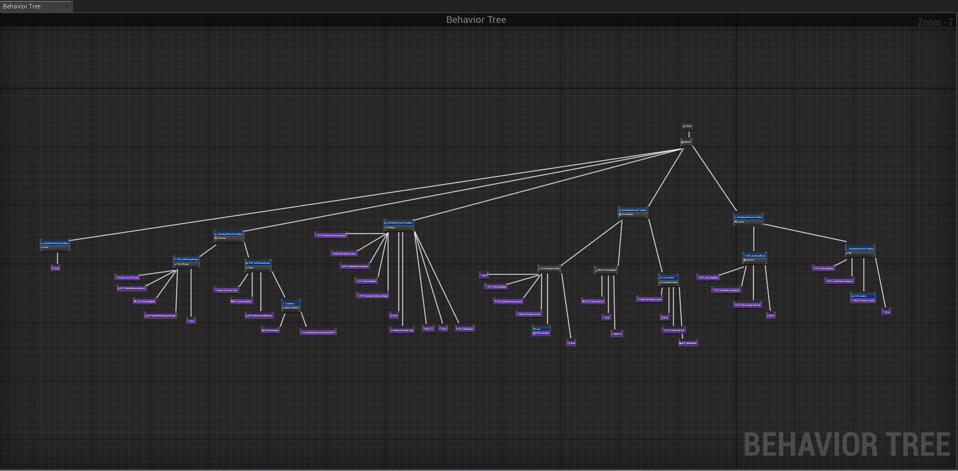 The Skeleton Archer Behavior Tree is more complex as it has to be able to calculate if the Skeleton Archer is in range of the player to make a ranged attacked. Also, this Behavior Tree switches between the states of Patrolling, Investigating, Seeking, Attacking, and Death. Within each state are other functions that execute behaviors and actions based on the different states.