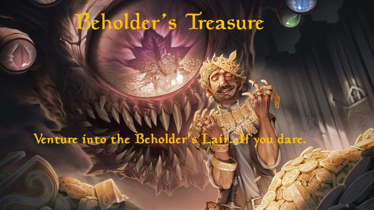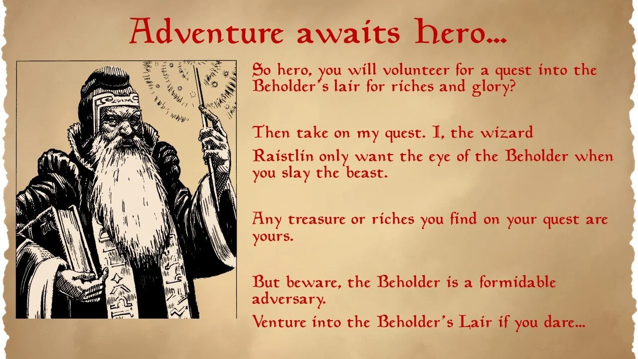 The Adventurer…tasked by the wizard Raistlin to delve into the Beholder’s lair for the eye of the Beholder. Beholders are creatures of madness and nightmares. Yet, the eye of the Beholder holds mystical and magical powers that can be a boon of power in a mere mortal’s hands. The Adventurer must heed caution to take on such a dangerous quest. Yet, with great risk, comes great opportunity and fortune, if you dare to venture into the Beholder’s Lair…