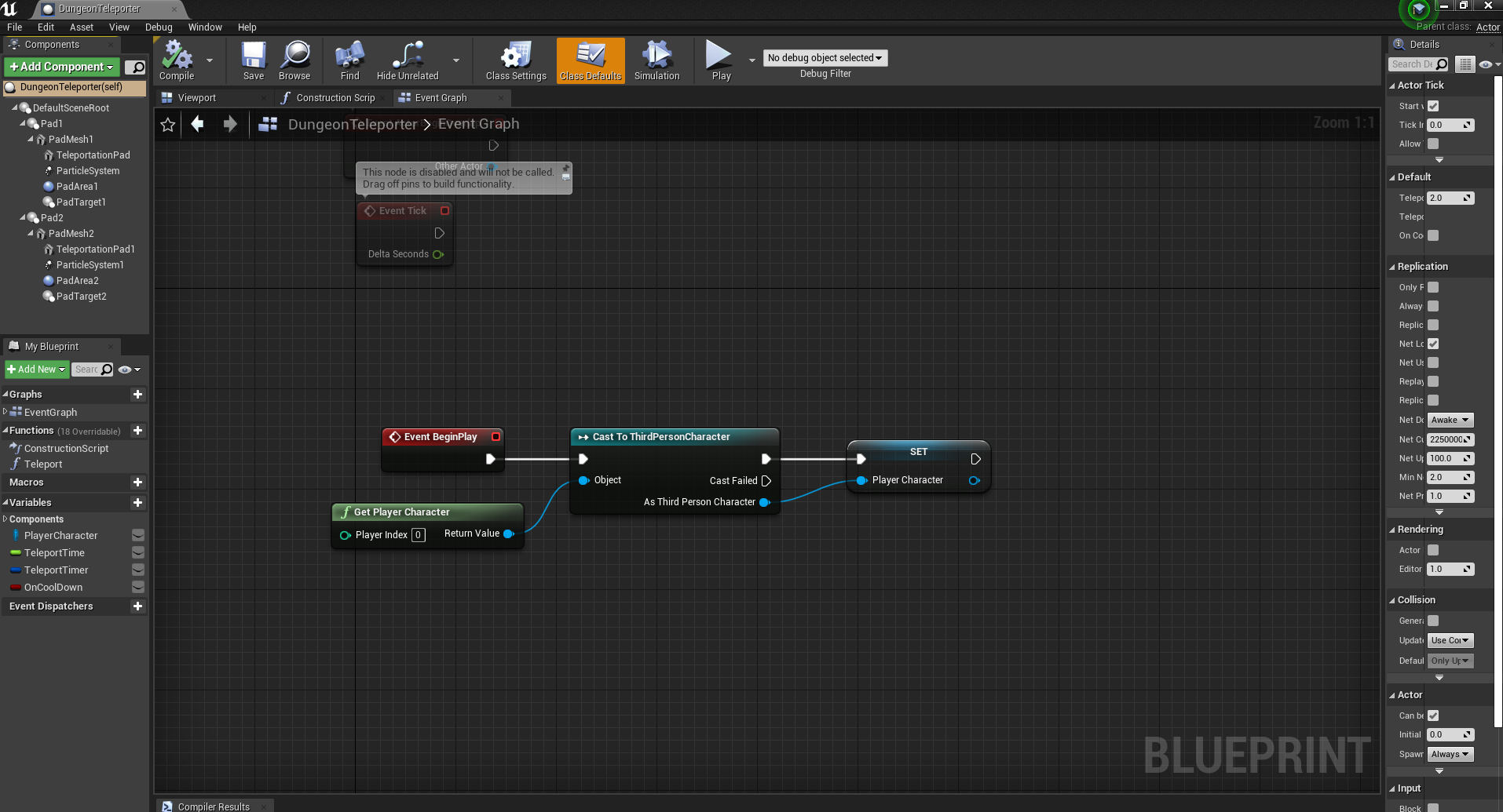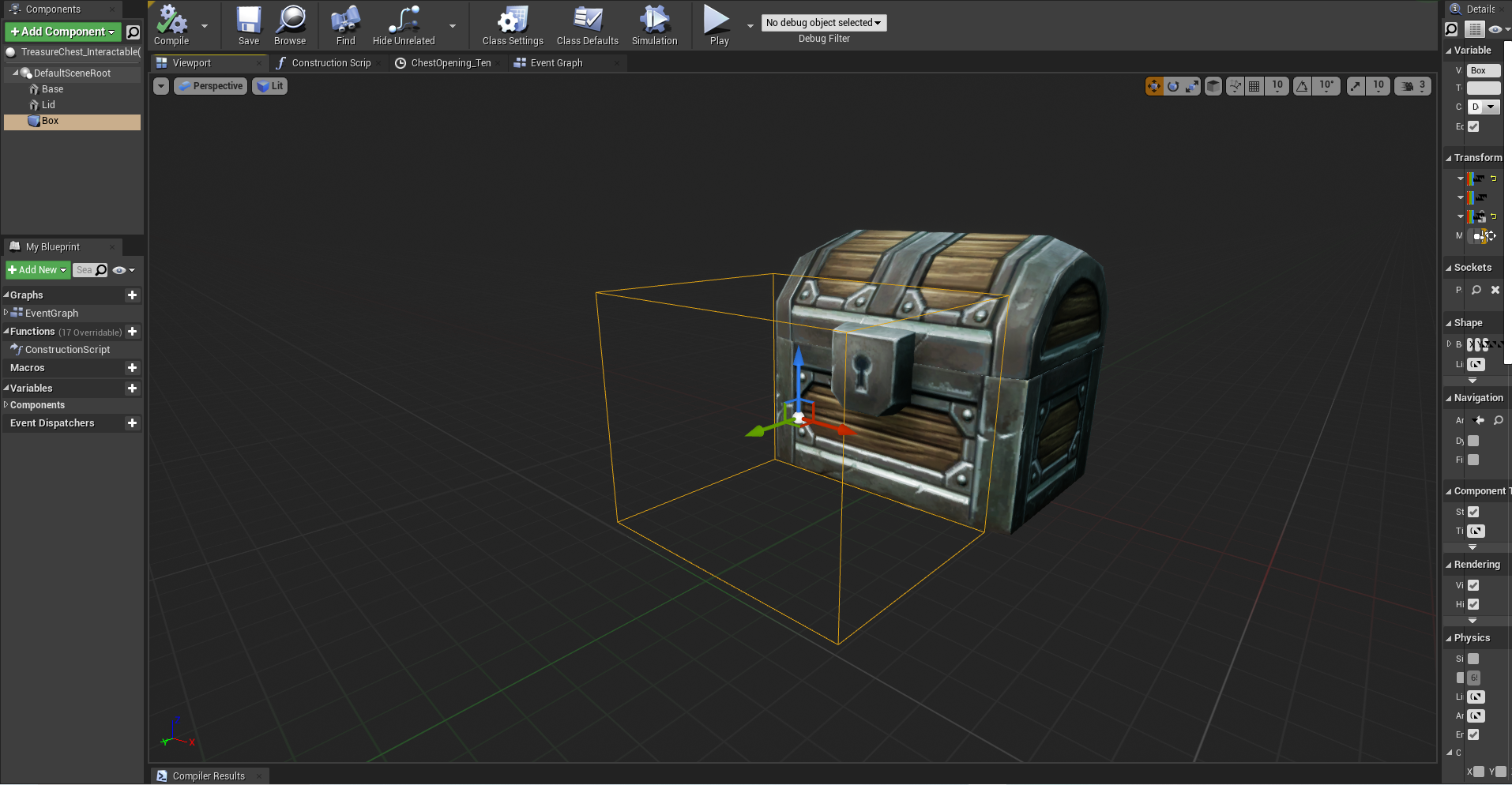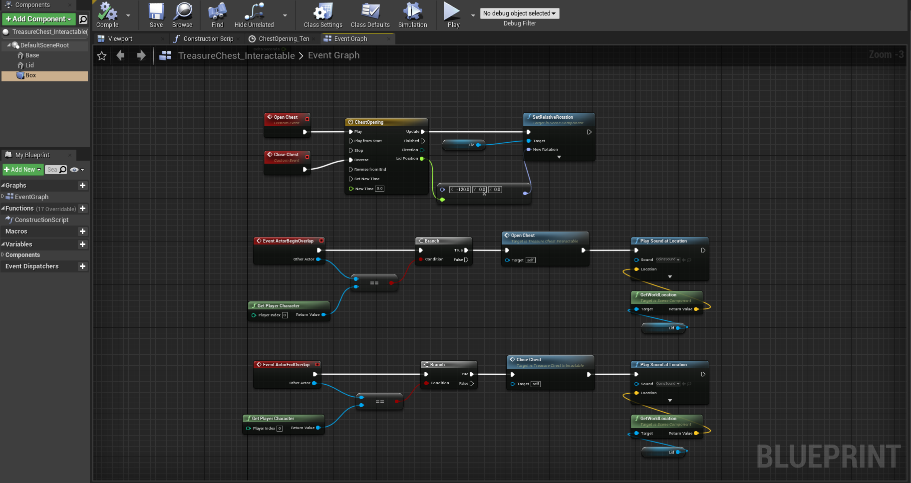 This blueprint contains the gameplay logic that allows the treasure box to be an interactable object in the prototype.