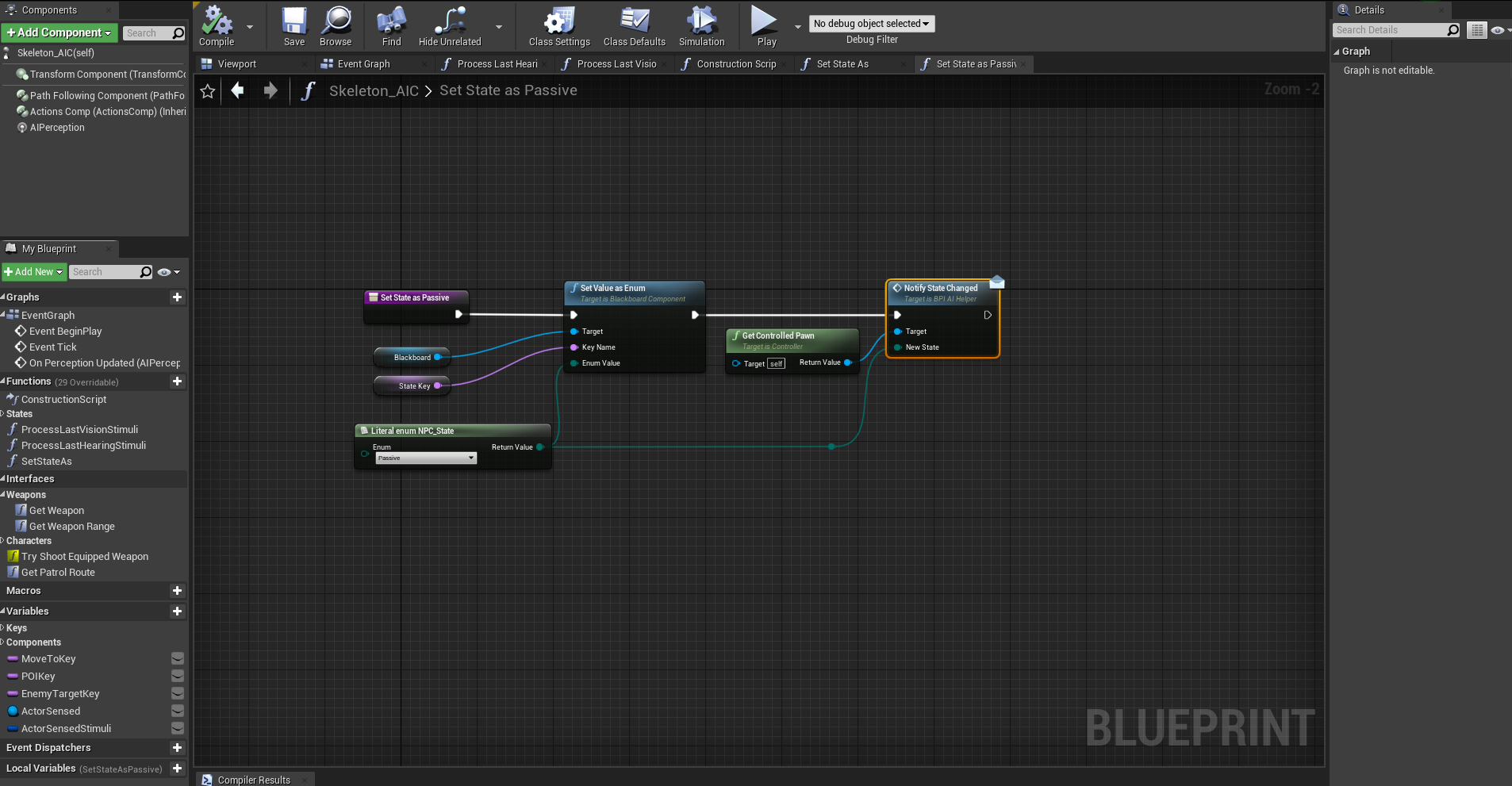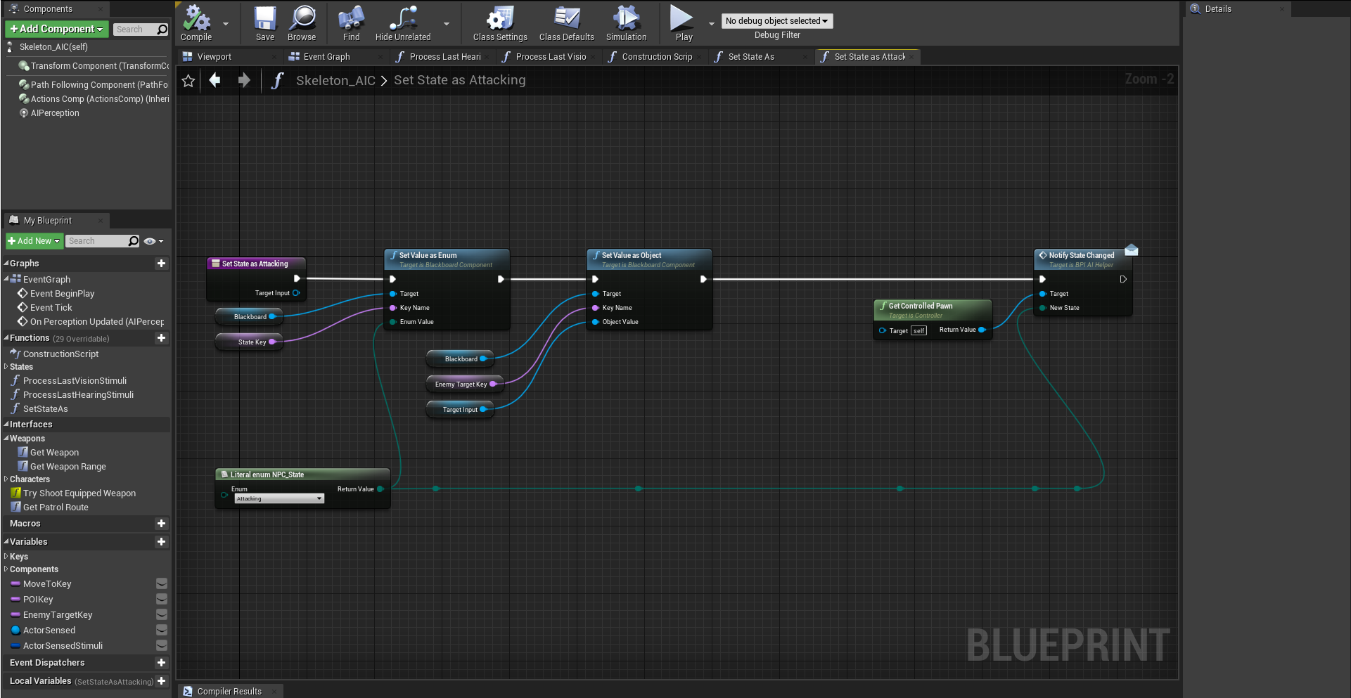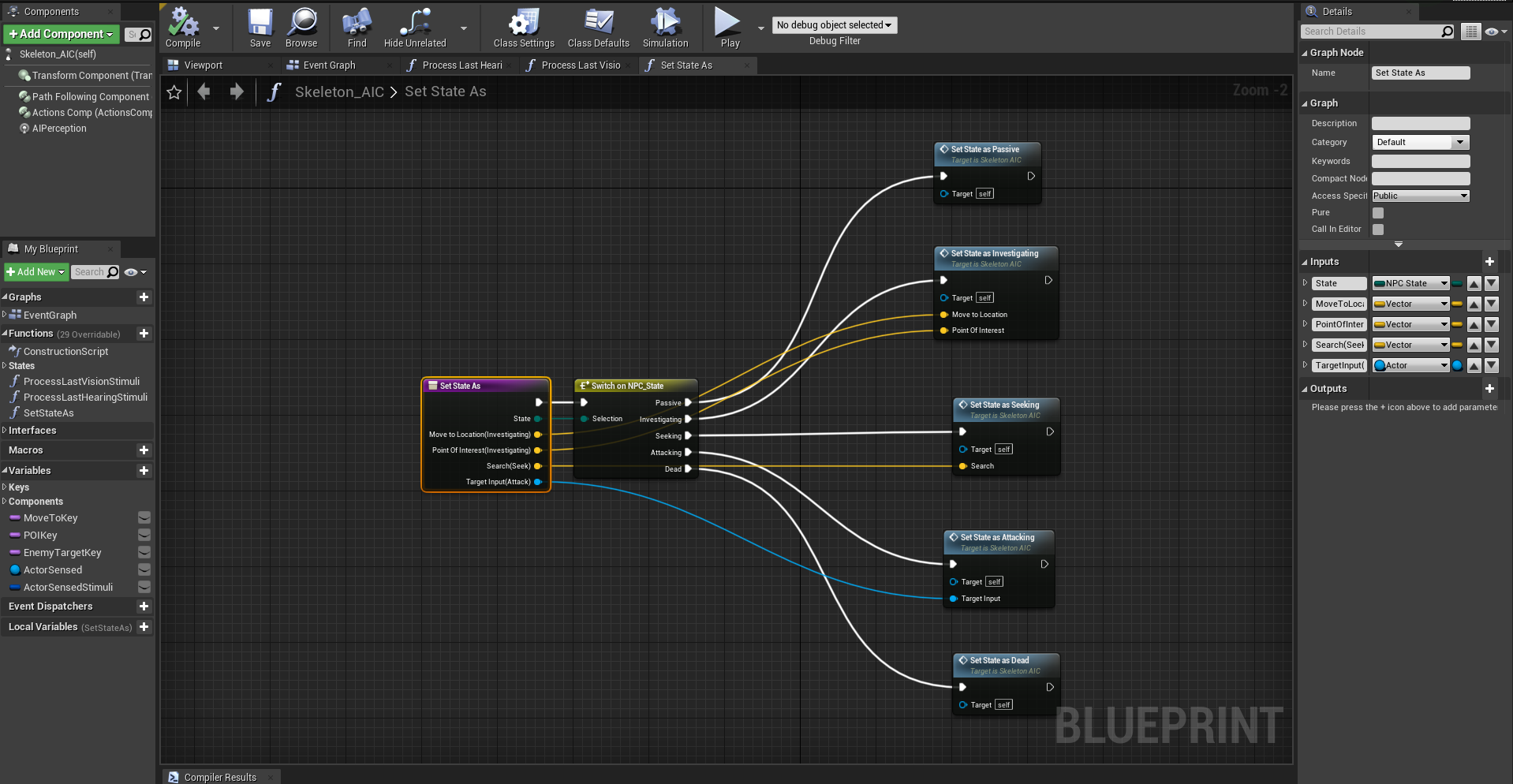 The behavior states of the skeleton archer can switch as needed in response to updated variables provided by the Blackboard which is updated in response to the player. This allows the Skeleton Archer to be a more robust form of Enemy AI with a ranged attack ability.