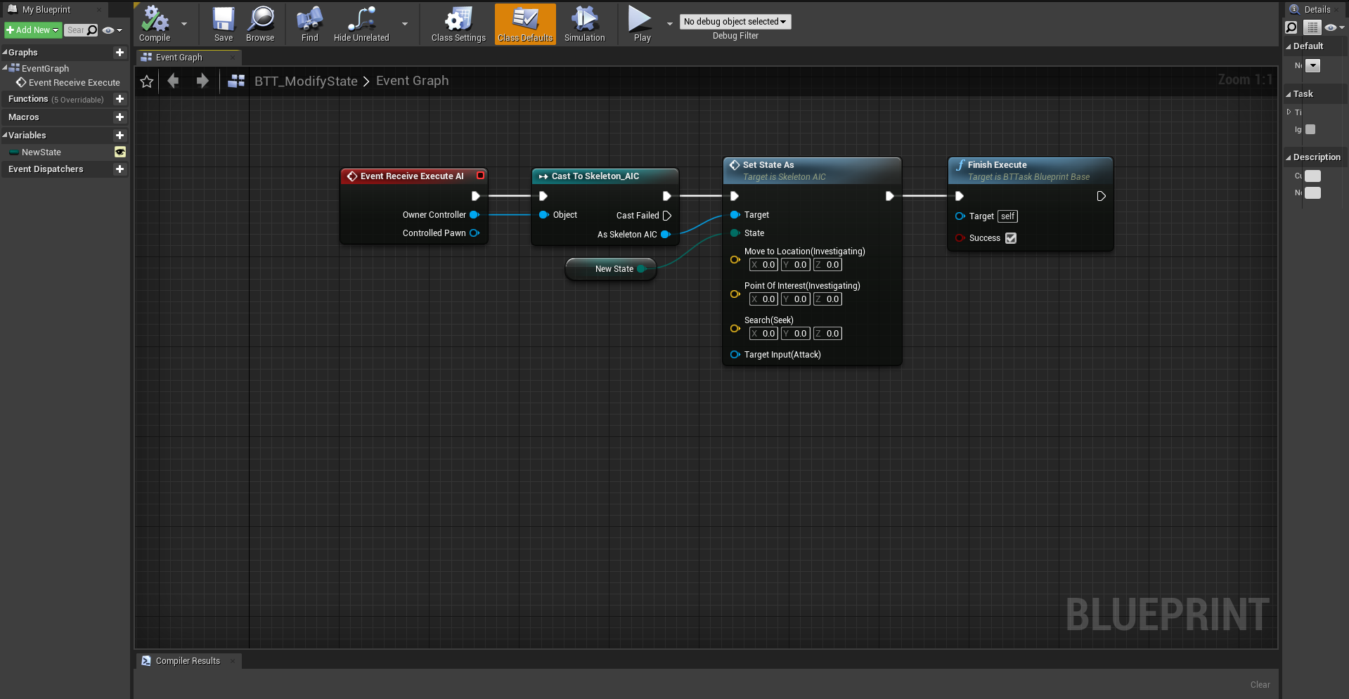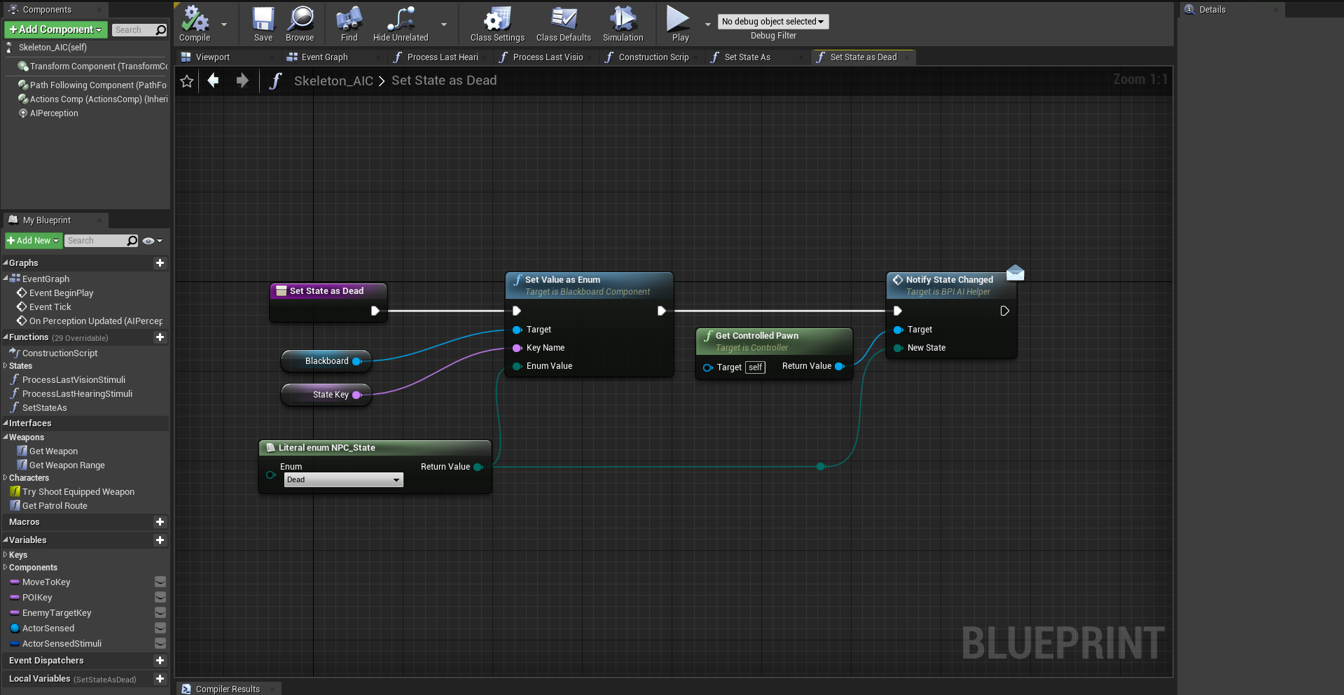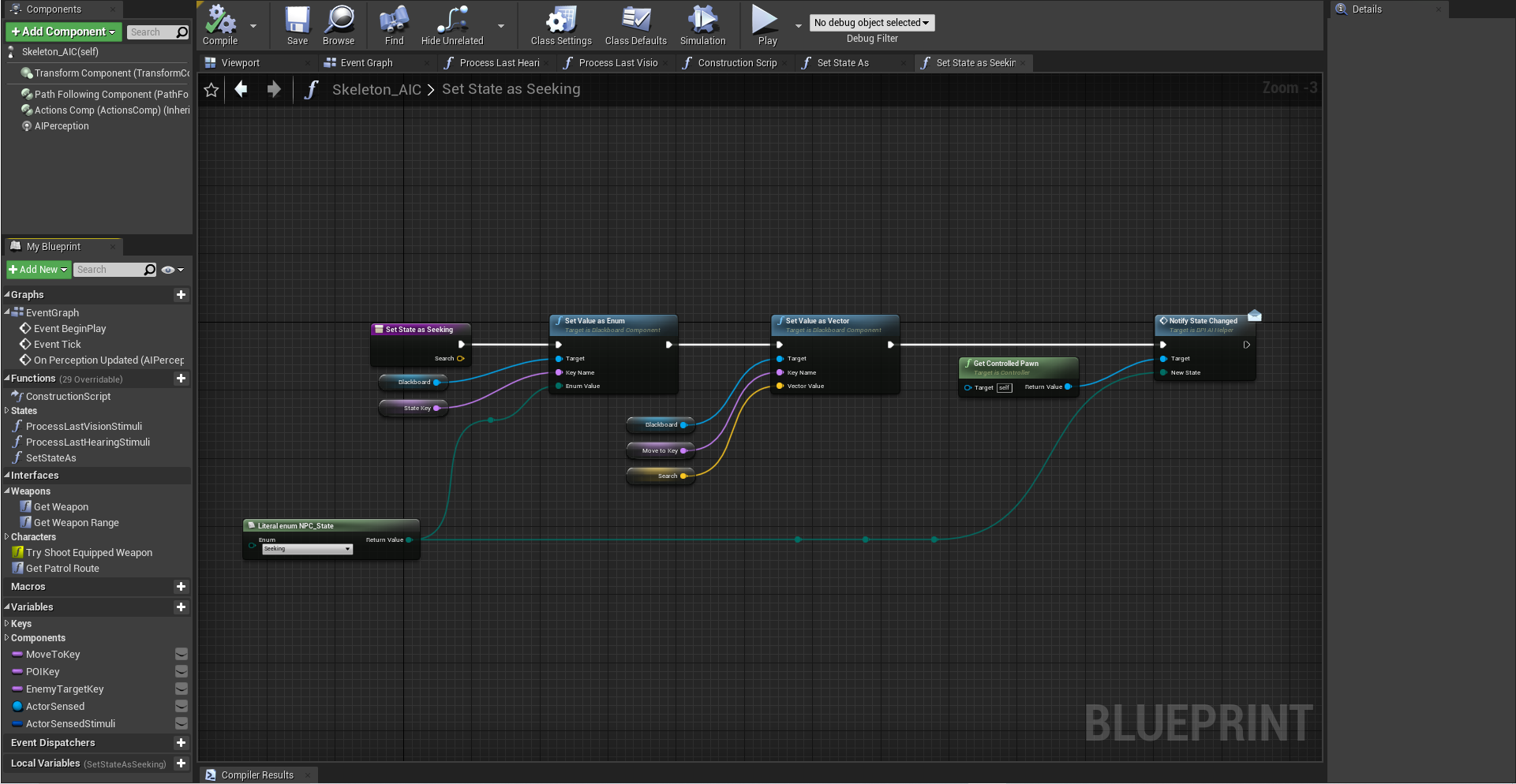 The behavior states of the skeleton archer can switch as needed in response to updated variables provided by the Blackboard which is updated in response to the player. This allows the Skeleton Archer to be a more robust form of Enemy AI with a ranged attack ability.