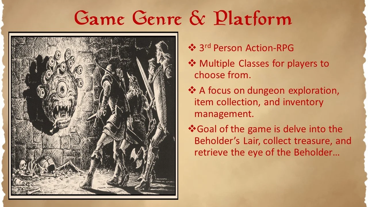 The Beholder is the main adversary that our player will face within this prototype. More deadly than any other creature faced in the depths, and born from madness and nightmares, the Beholder protects is treasure from would be adventurers with henchmen, magic, and sheer cruelty. An adventurer should proceed with caution when venturing into the lair of the Beholder seeking the Beholder’s Treasure…