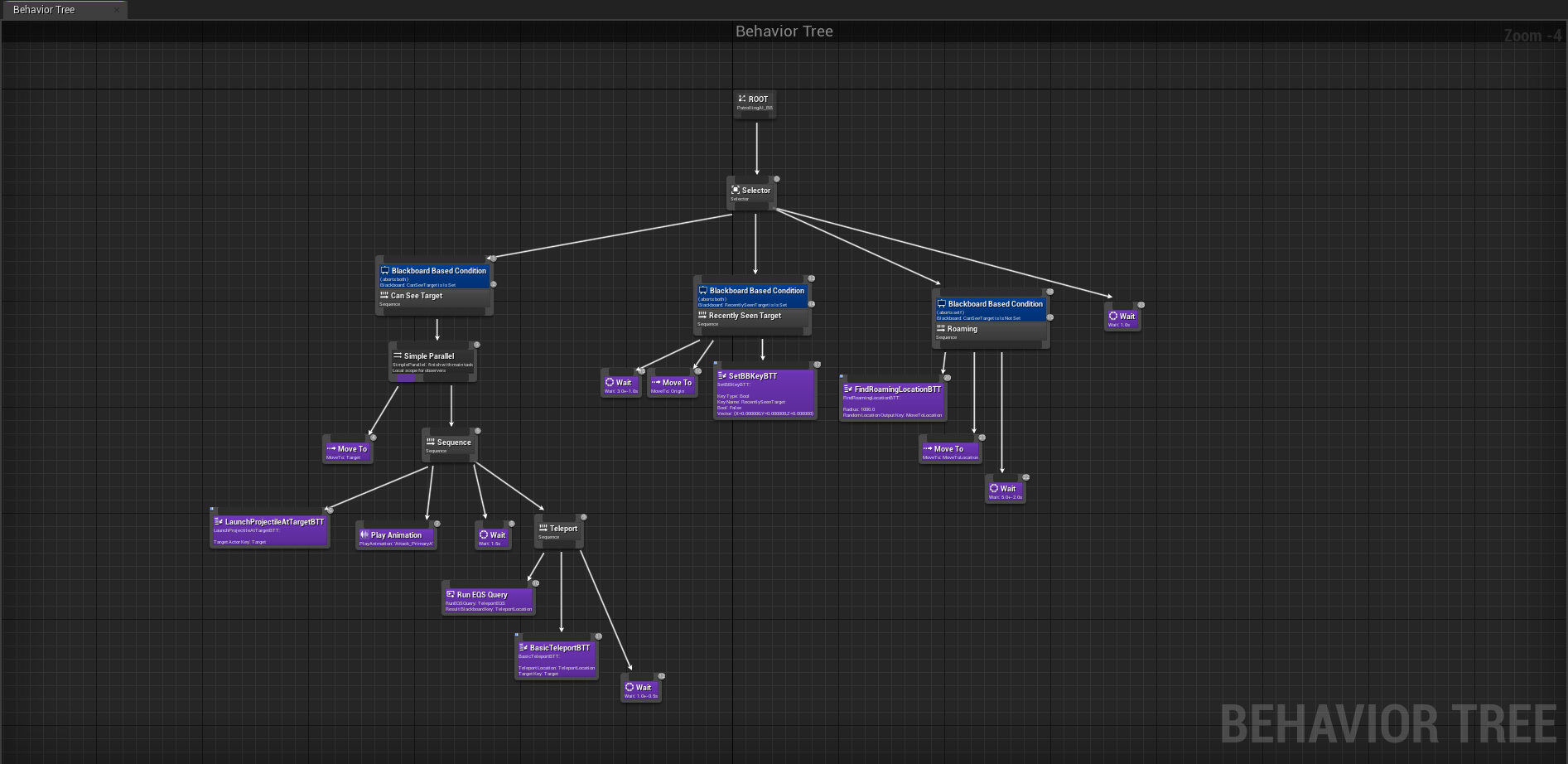 The Skeletal Mage Behavior Tree has a different system because of the EQS query in its behavior tree. The Behavior Tree is broken into three main branches, Can See Target, Recently Seen Target, and Roaming.