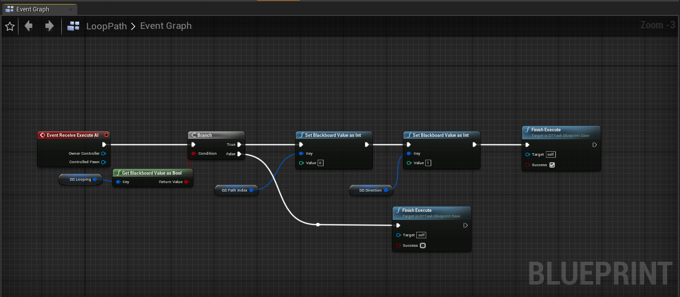 The Enemy Behavior Tree has tree main branches: 1.) Can See Player; Can’t See Player; and 3.) Patrol Path. Within these three branches are more sub-branches that hone in on the type of behavior needed.