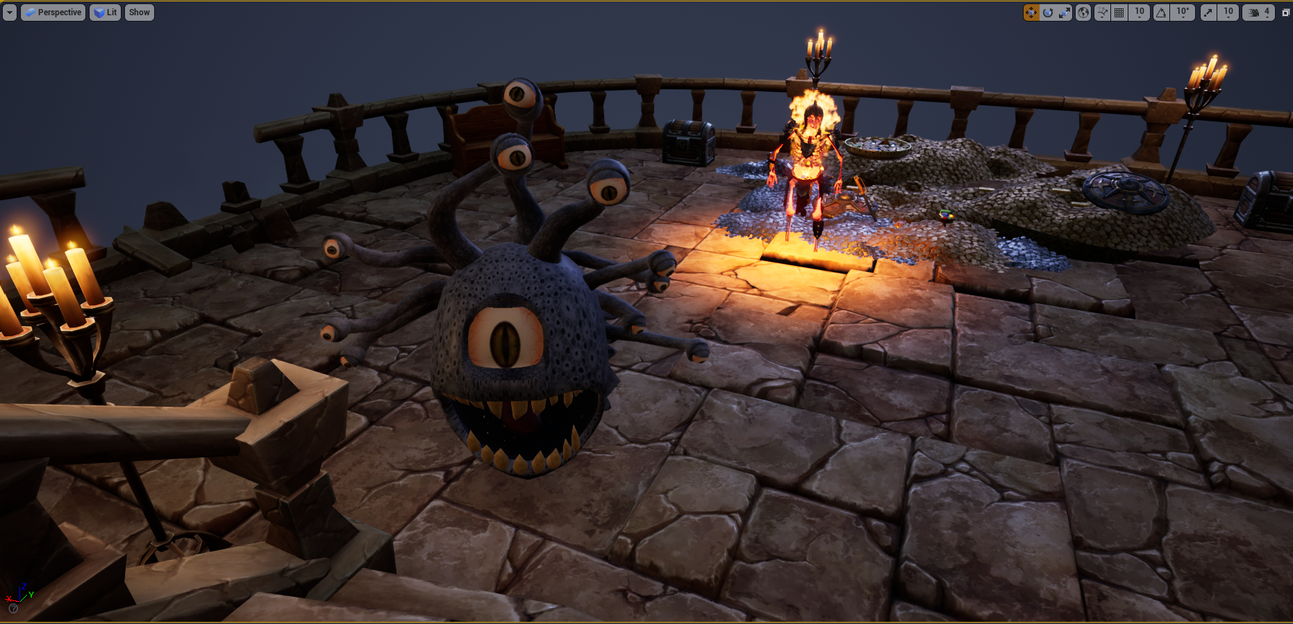 Ownership: Gameplay Programming, Game AI programming, Technical Art for retargeting Characters and Animations, Creating Chest and Portal Assets, Implemented Beholder Enemy, Skeleton Warrior, Archer, Skeleton Mage, and Dragon.