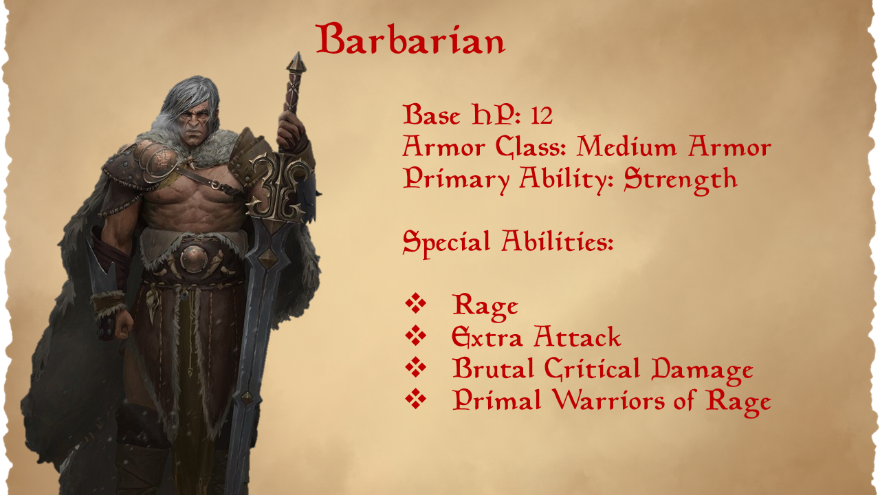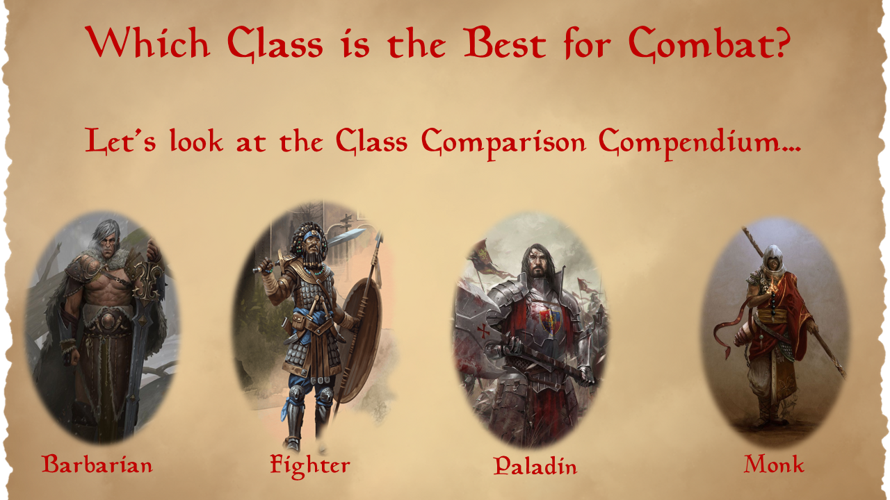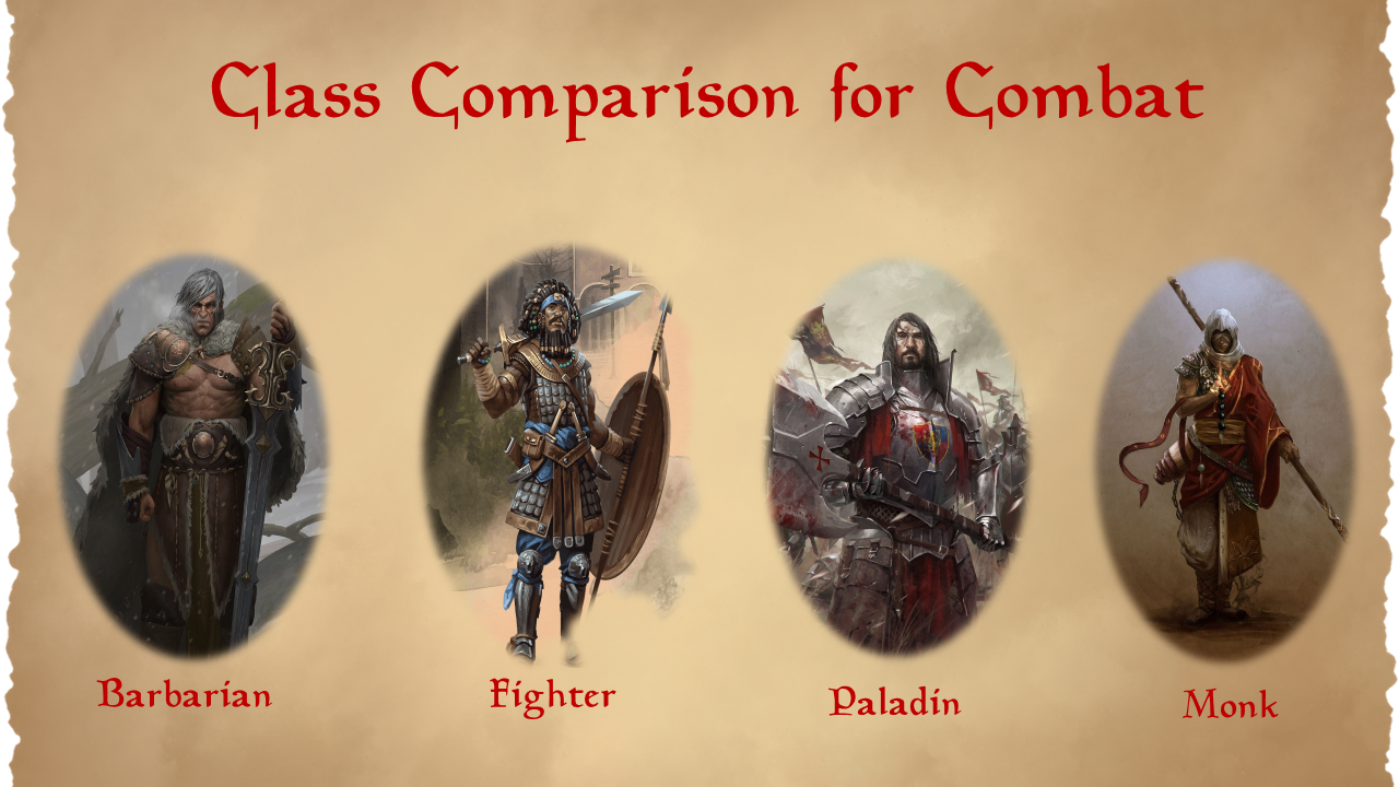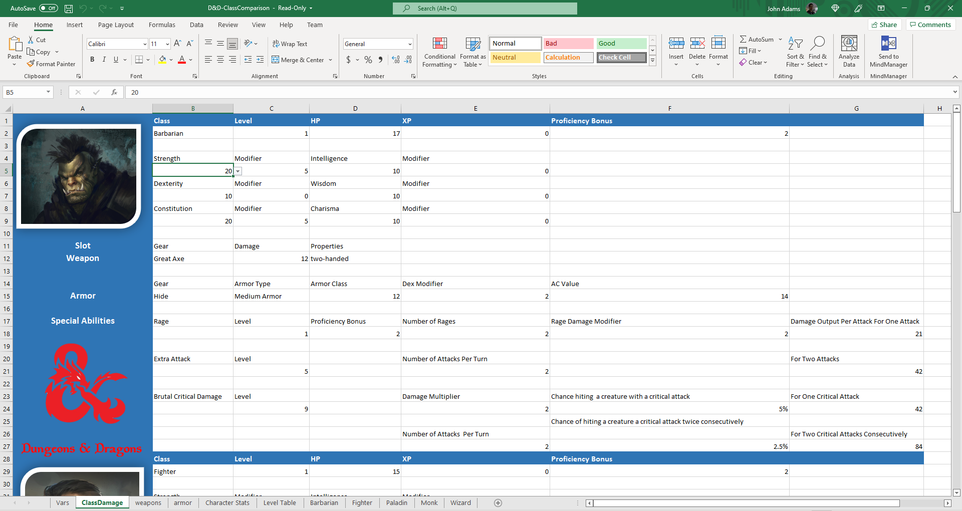 This Class Comparison Compendium was an assignment while I was at FIEA in Game Design II. The purpose of the Assignment was to create a mathematical model representing an analysis of a game system. For this assignment, I decided to compare the four primary fighting classes the Barbarian, the Fighter, the Paladin, and the Monk. My goal was to analyze for one attack, which class at the highest damage potential based on class, character stats, level, and class special abilities. Below, you can the presentation and a discussion of the spreadsheet I designed.