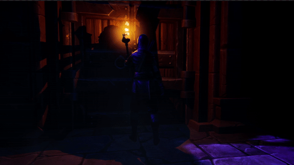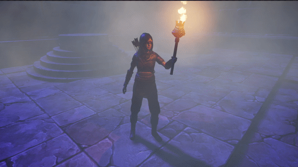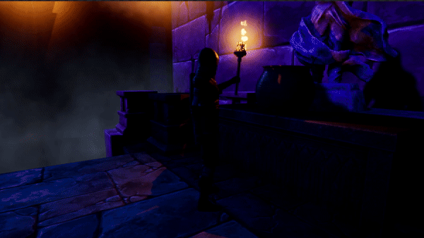 The visual effect for this in the prototype aids in setting the mood for the game, and also provides a puzzle for the player before moving forward. Finally, the flame particle effect provides a feedback loop to allow the player to understand that something has changed in the game world.
