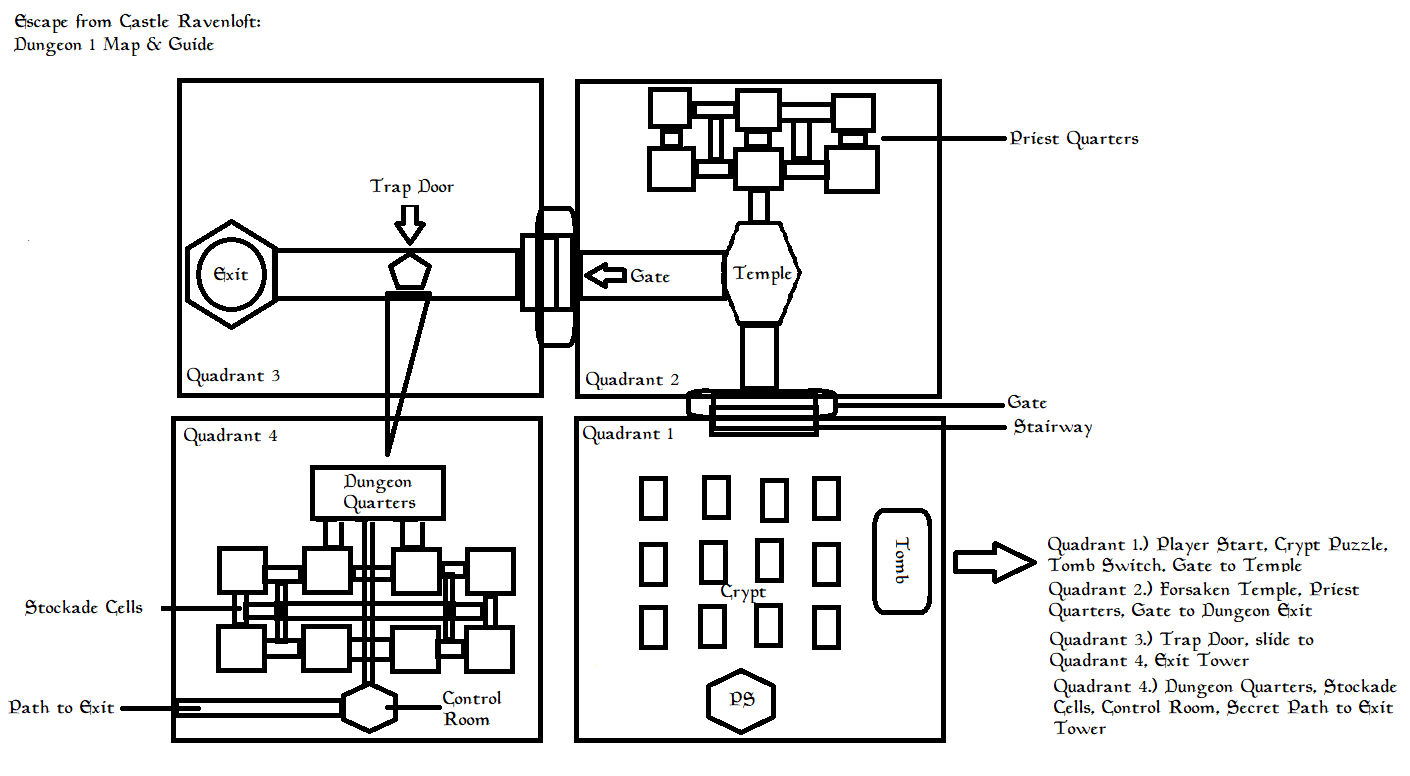 For this prototype, I took inspiration from the catacombs of Castle Ravenloft. Due to the time constraints of the project, I made adjustments to the level prototype to allow time to complete the prototype.
