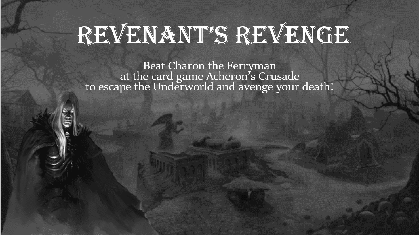 Revenant’s Revenge is a collectable card game where you must escape the Underworld through a game of Acheron’s Crusade. You must choose your Court for your deck of cards, and you must have ferry tokens to play against your opponents. Only by beating Charon the Ferryman in the card game of Acheron’s Crusade can you escape the Underworld and get your revenge!