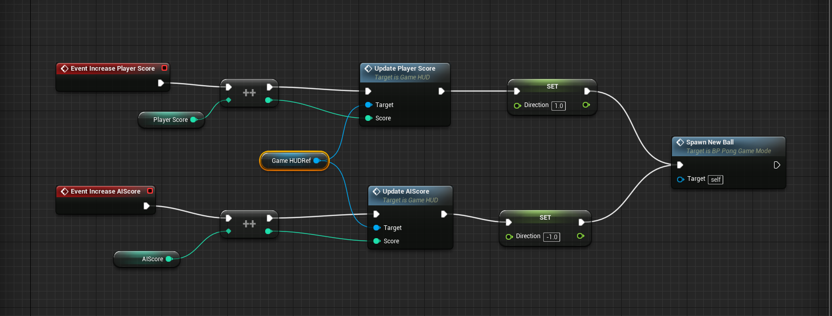 The main functions in the class deal with increasing either the Player’s or the Player AI’s score. And the function to spawning a new ball is stored here also. Finally, the properties for the direction, ball speed, and the Player Score and AI Score are stored in this class.