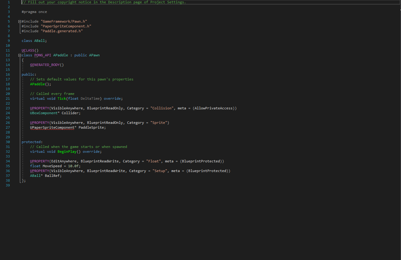 In the Pong Paddle header file, a reference to the ball class is stored. In the Paddle class, the properties of the collider for the paddle and its sprite reference are stored. Finally, its UProperties are stored within the header file.
