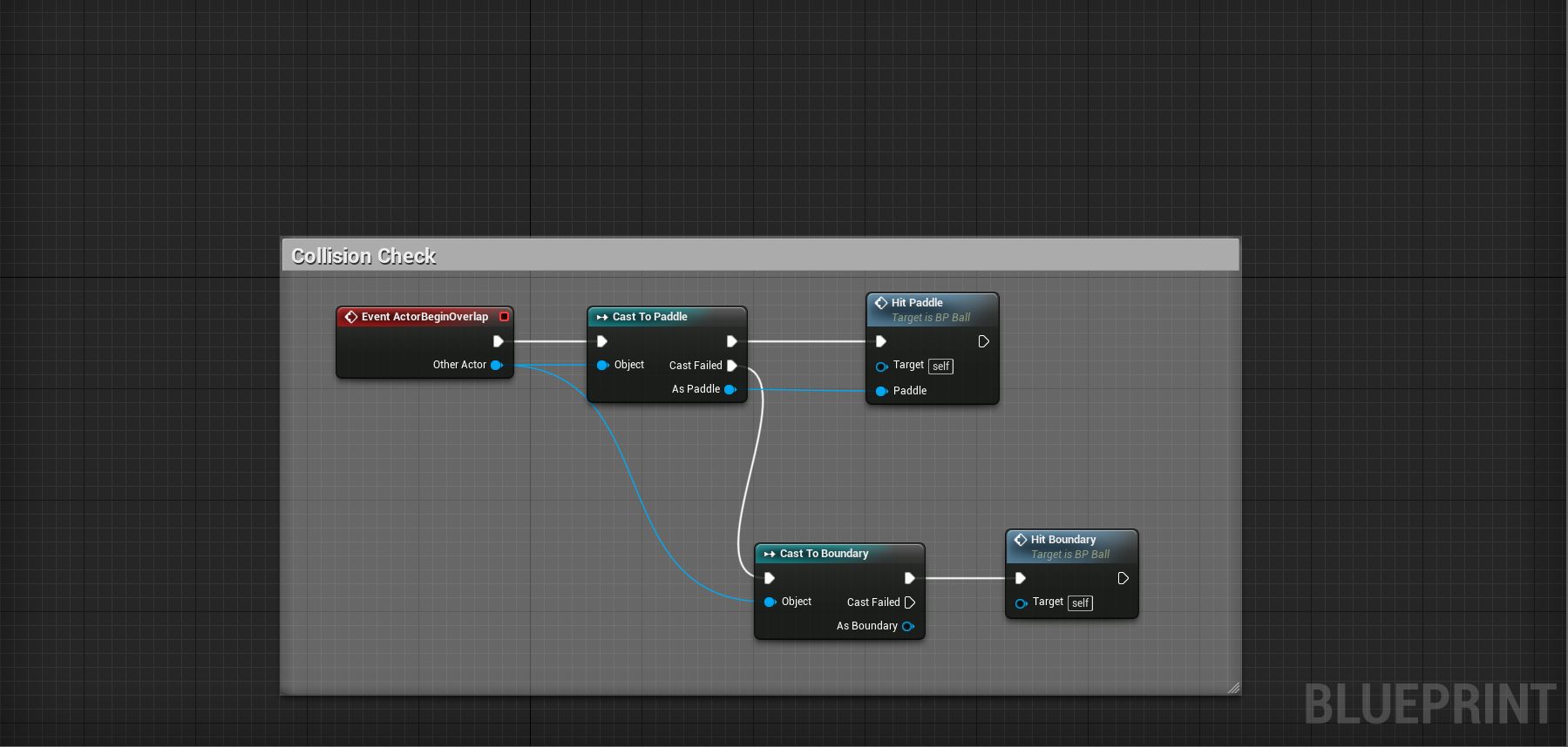 This Event ActorBeginOverlap function casts to the paddle to determine if the paddle was hit by the ball.