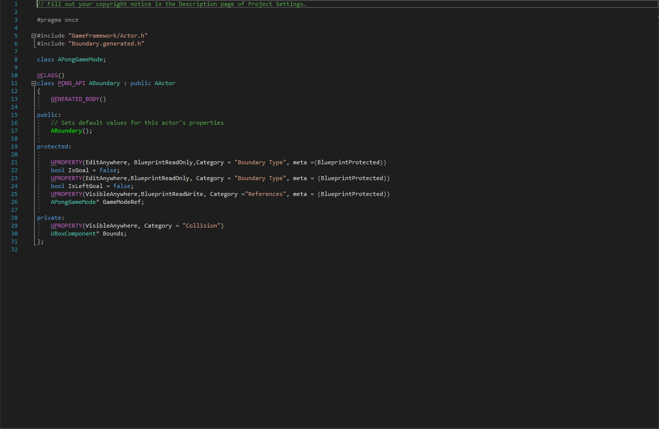 In the Pong Boundry Header file, a reference to Pong Game Mode is stored Within the Boundary class, are references to the UProperties for IsGoal and IsLeftGoal. Finally the UBoxComponent reference for the Bounds is set to private.