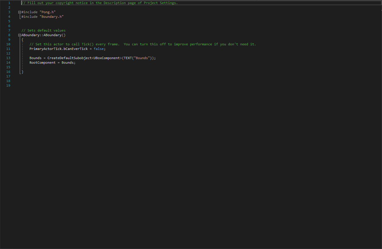 Here is the CPP File for the Pong Boundary Class. It creates the Box Component for setting the bounds and sets the Root Component equal to the Bounds.