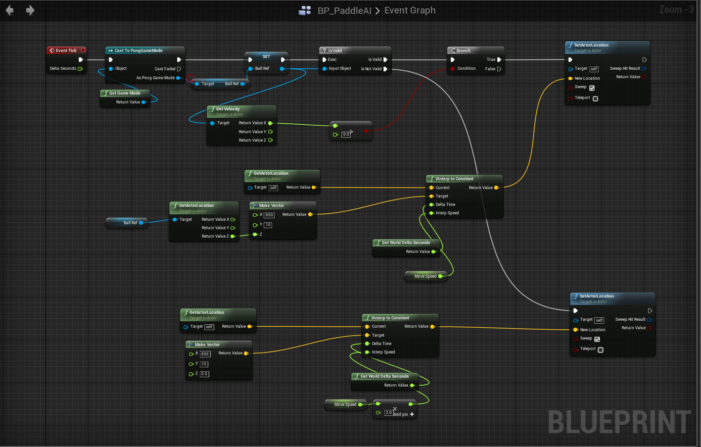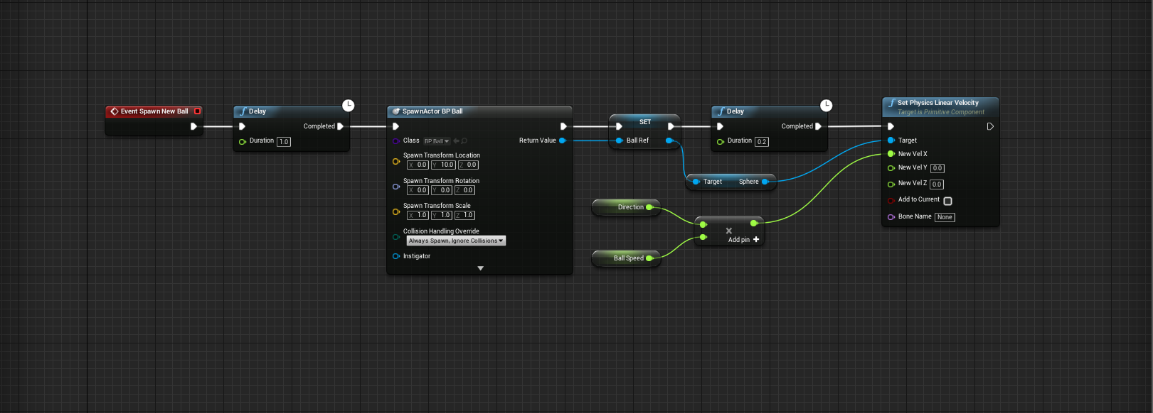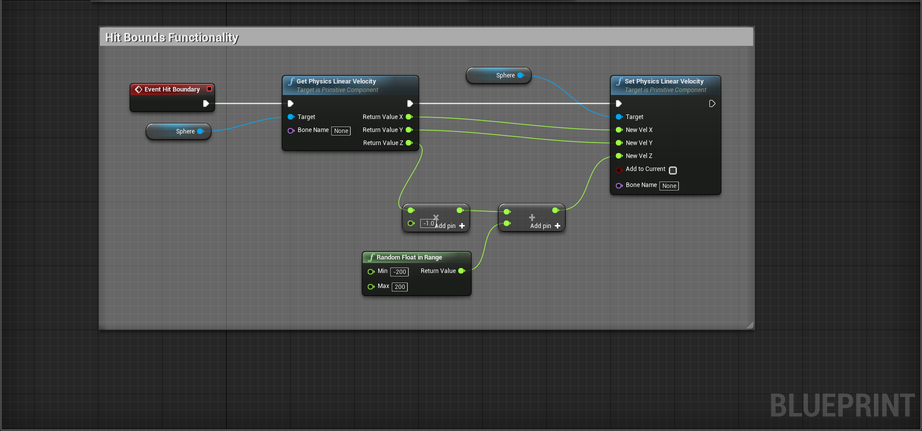 This blueprint calls a custom event that takes in the parameter of the sphere and gets the velocity of the ball. The function keeps the ball in range and ensures that it does not go out of boundaries.