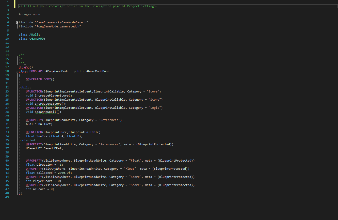 In the Game Mode Header file a class reference to the ball class and the Game HUD are stored.