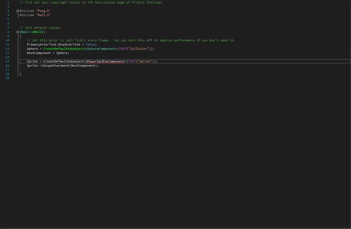 Here is the CPP File for the Pong Ball class. the CPP file includes the Ball header file and creates the sphere collision for the ball actor. Finally, it sets up the attachment to the root component.