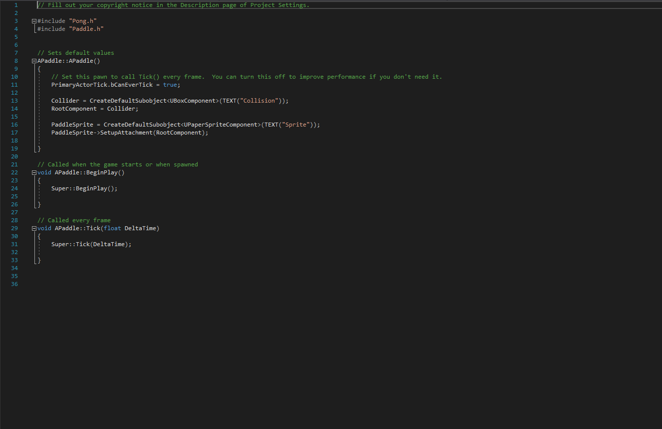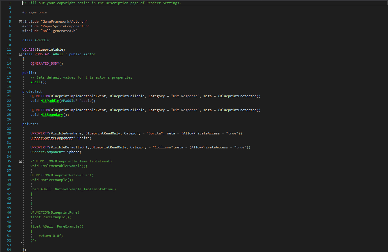 In the Pong Ball Header file, the class for the Ball is stored along with its functions for hitting the paddle, and hitting the boundaries. Also, the properties that are stored within the class are contained here. The functions HitPaddle() and hit HitBoundary() are Blueprint callable and are of the category, “Hit Response”. Most of all, this Pong Ball Header file provides the properties and functions that will be instantiated in the Ball Blueprint.