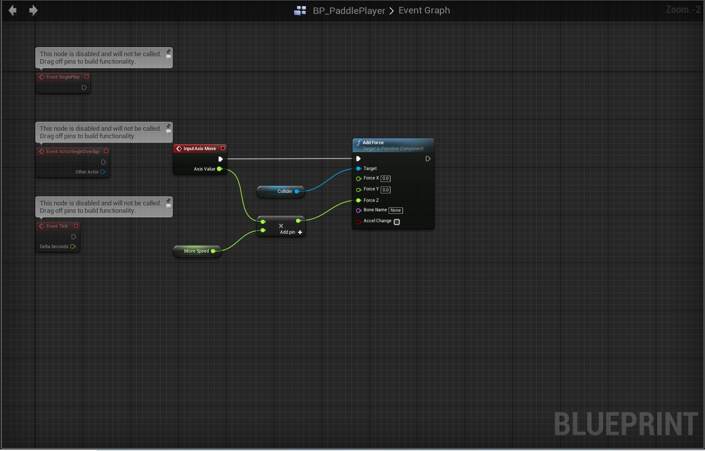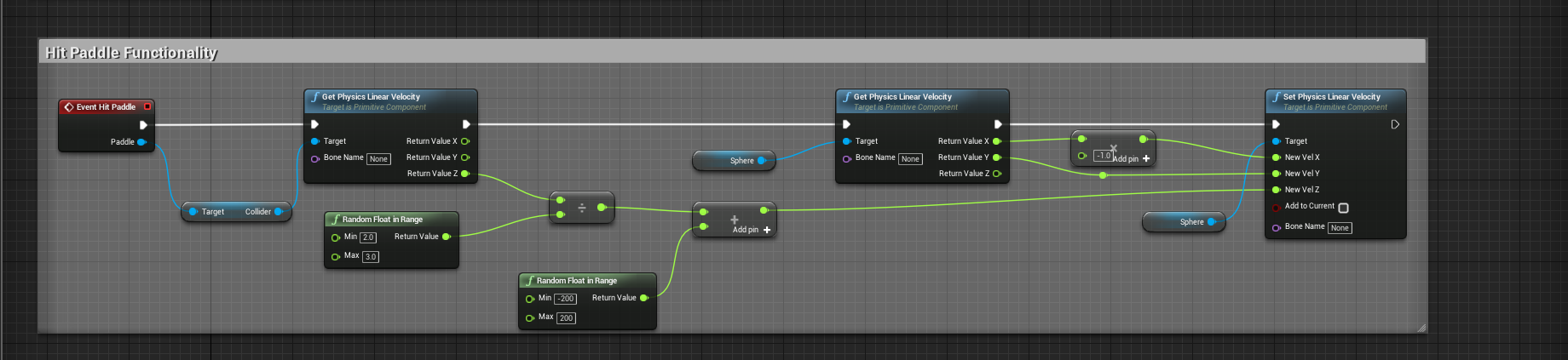 This custom event takes in the target’s collider and gets its velocity to set a new velocity and bounce the ball off of the paddle.